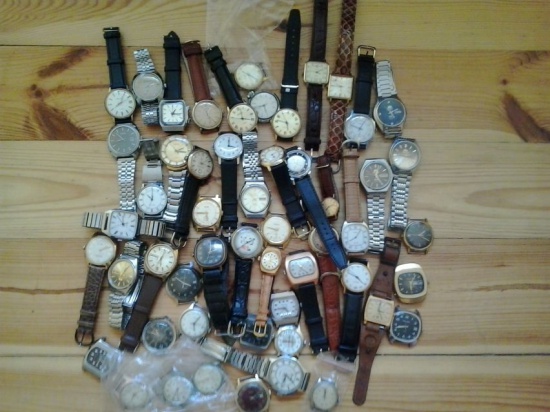 Sprzedam kolekcje około 50 zegarkow mechanicznych z lat 50-90 wiekszosc grubo pozlacanych mechaniczne w tym np. Orienty o naciagu automatycznym. Rakety , Poljoty, Wostoki ,Pobiedy, ZiMy , itp itd . Praktycznie wszystkie zegarki sa meskie .Jest to likwidacja mojej kilkuletniej kolekcji.Zegarki sa sprawne i zadbane w b.dobrych stanach. Na zdjeciu jest pokazana czesc kolekcji.  Cena 1500 zł